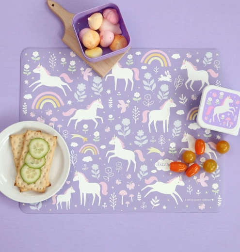Velikodušne mere zagotavljajo dovolj prostora za krožnik, pribor in kozarec. Pastelna vijolična z motivom samorogov in mavrice polepša otroško mizo in ustvari veselo vzdušje pri obrokih.