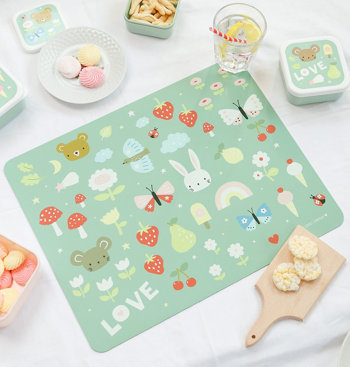 Praktična otroška podloga v intenzivno zeleni barvi z igrivim motivom se prilega vsaki mizi. Zahvaljujoč trpežnemu vinilu se zlahka čisti, dolgo časa izgleda odlično in ščiti površino mize pri vsakodnevni uporabi.