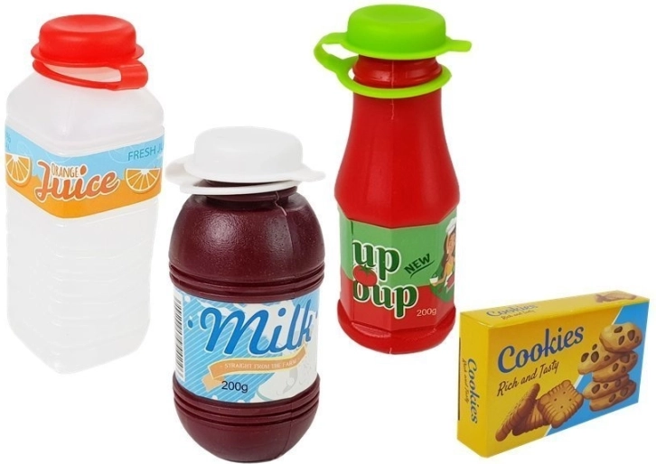 Komplet živil, kot so mleko, sok, kečap in piškoti, popestri igro in otrokom omogoča ustvarjanje različnih nakupovalnih scenarijev.