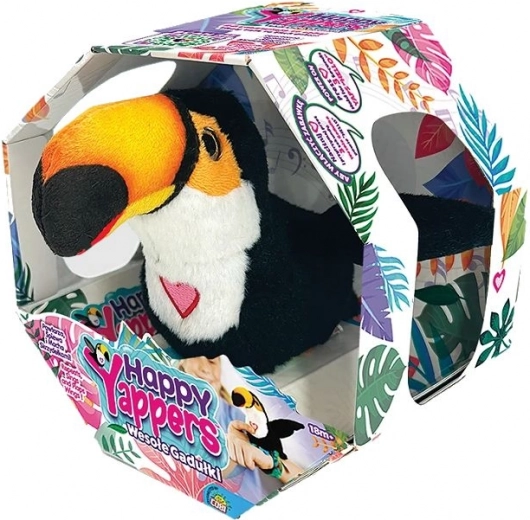 Odkrijte barvitega prijatelja, ki podpira čutni razvoj in veselje do igre. Interaktivni tukan Happy Yappers reagira na dotike in zvoke – maha s perutmi, oddaja igrive ptičje tone in zna ponavljati besede, ki mu jih poveste. Po pobožanju po hrbtu se oglasi s prikupnimi trilčki, ki jih imajo otroci radi.