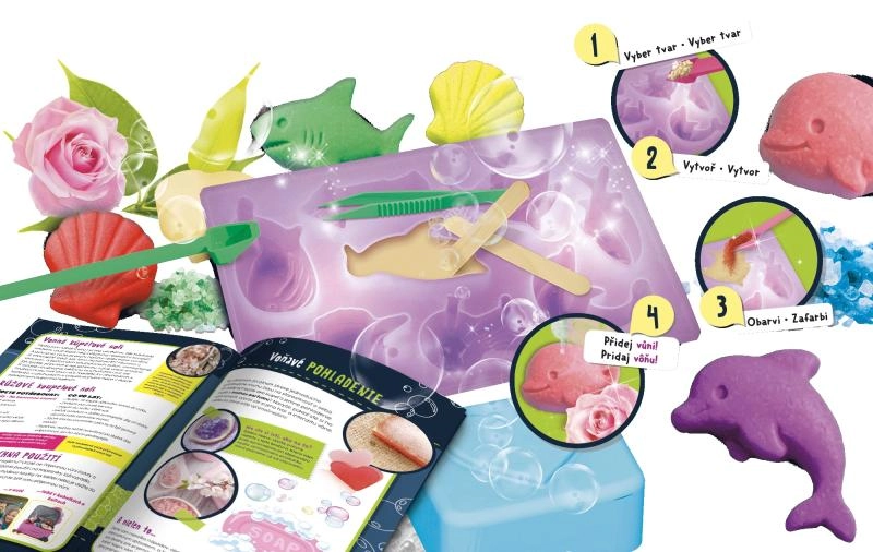 Ta zabaven in poučen komplet vam omogoča, da preprosto izdelate izvirna mila z motivi morskih bitij. Zahvaljujoč pripravljenim modelčkom in glicerinovim kosmičem je postopek preprost, varen in hiter. Dodajte barvno esenco in priljubljeno dišavo ter ustvarite darila ali dišeč okras za kopalnico.