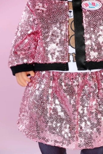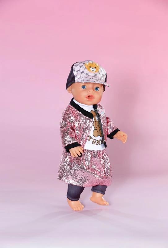 Podarite svoji punčki ali medvedku BABY born Teddy edinstven slog s tem bleščečim kompletom oblačil za velikost 43 cm. Set vsebuje rožnato bleščičasto jakno, krilo, majico z medvedjim potiskom, kape in legice – idealno za kreativno in dolgotrajno igro. Vključeno je tudi obešalnik iz recikliranega materiala za bolj trajnostno igranje.