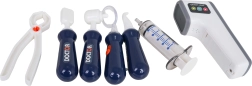Stetoskop, termometer, injekcija, pinceta, škarje, zobozdravstvena orodja, »rentgenske« kartice, model zob, kartica pacienta in drugi dodatki.