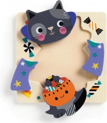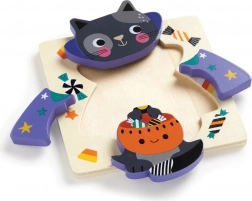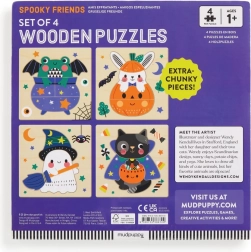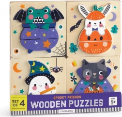 Komplet vsebuje štiri samostojne lesene sestavljanke z nežnimi noč-čarovniškimi ilustracijami avtorice Wendy Kendall. Vsaka sestavljanka ima gladko leseno osnovno ploščo z naslikanim prizorom, v katerega otroci zlahka vstavljajo velike koščke. Odlično kot prva sestavljanka – varna, pregledna in zabavna.