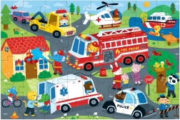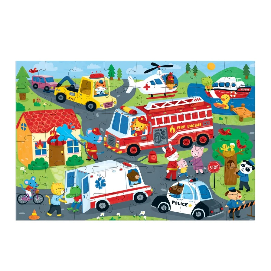 Velike talne sestavljanke MUDPUPPY Reševalna vozila bodo navdušile vse male ljubitelje siren in akcije. Z 48 skrbno izrezanimi kosi bodo otroci zlahka sestavili prizor, poln gasilcev, policistov in reševalcev. Veliki kosi se odlično držijo, ne drsijo in pomagajo razvijati fino motoriko, zbranost in domišljijo.