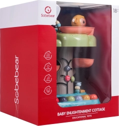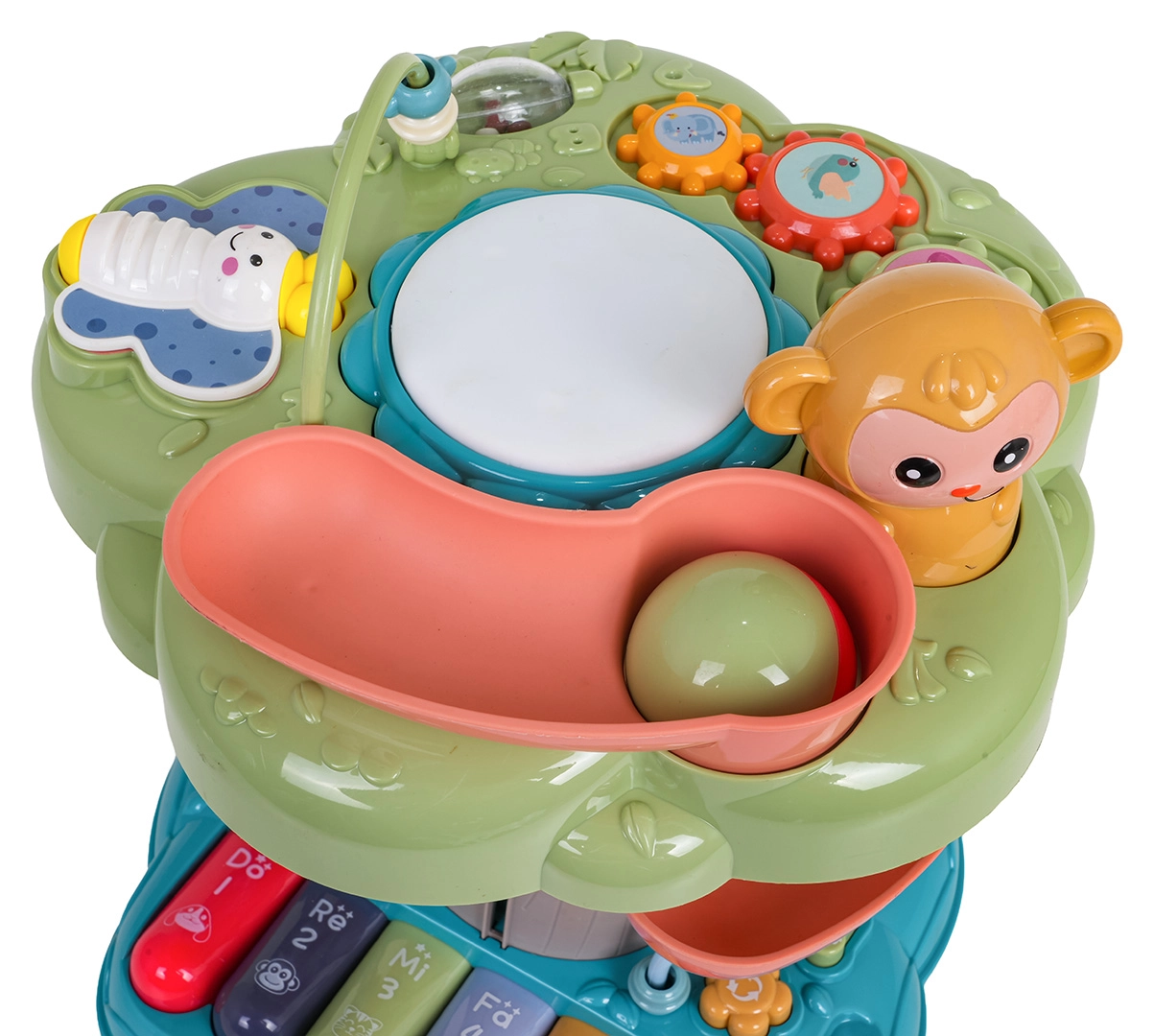 Ne manjkajo kroglice na žički, zobniki, odstranljivi ragljice in živalice na vrvici za uparjanje oblik. Otroci lahko pritiskajo gumbe, vrtijo, premikajo in bobnajo – vsako dejanje sproži zvok ali svetlobo. Igrača je izdelana iz trpežne plastike brez ostrih robov in je zasnovana za varno igro doma.