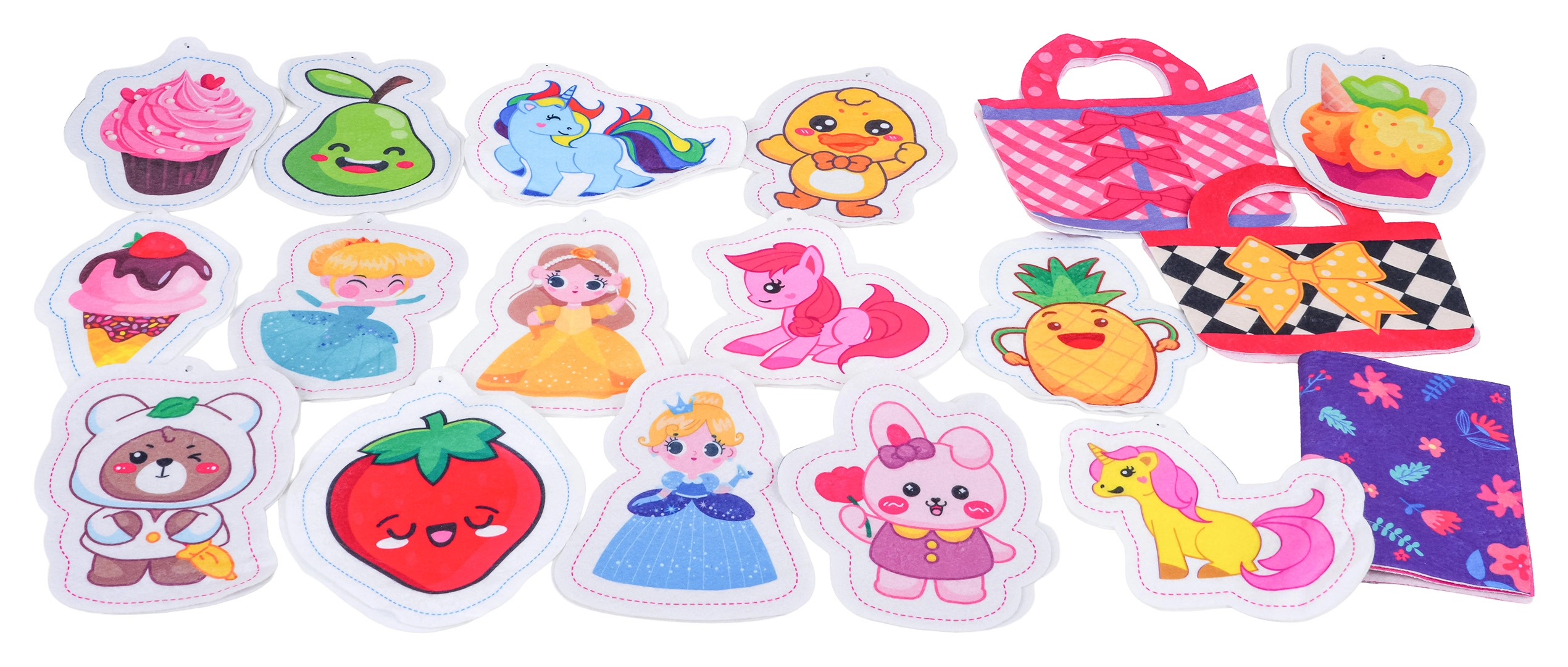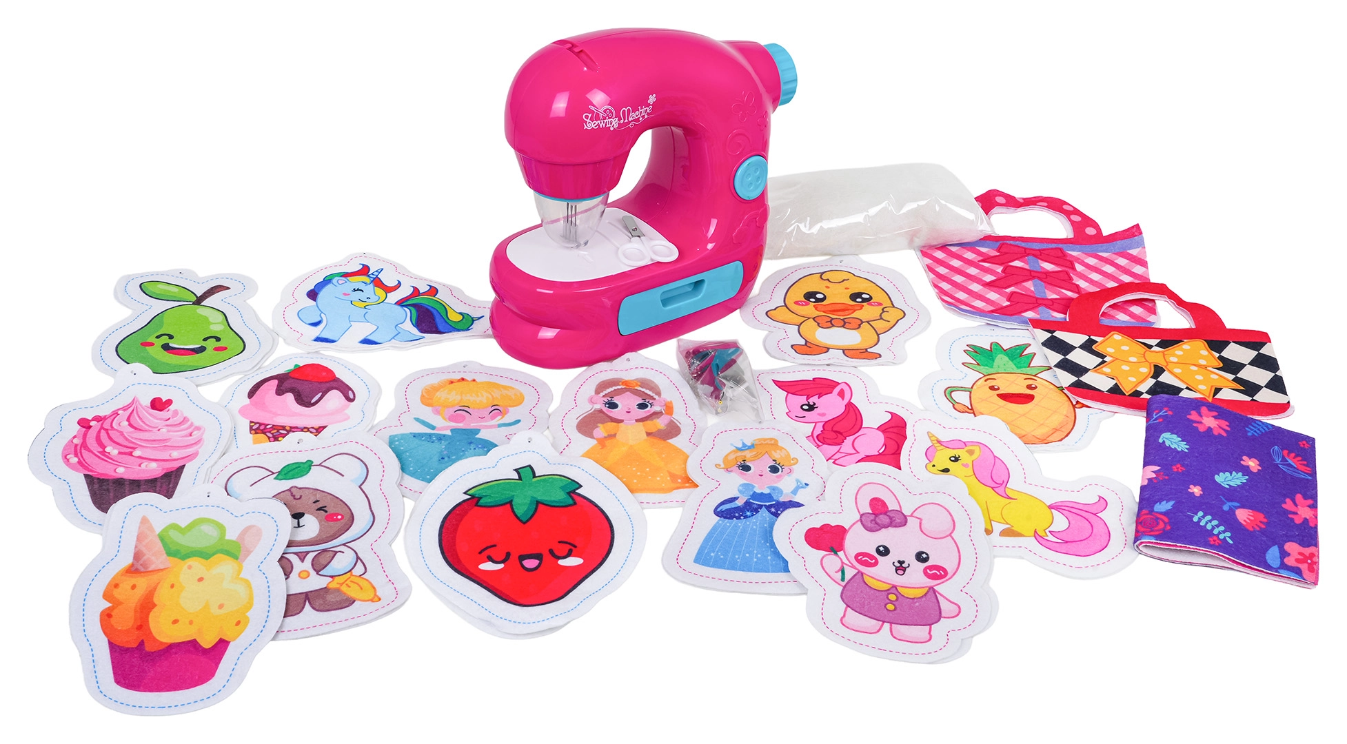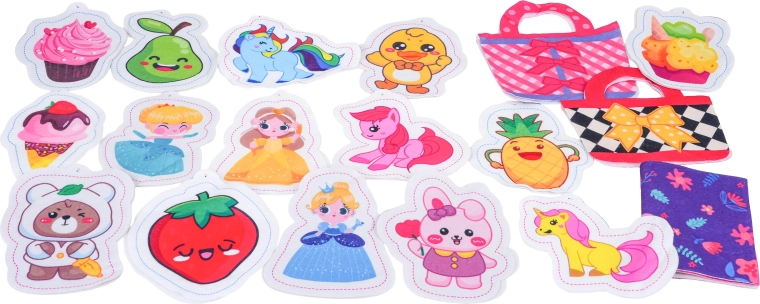 Del seta so filcane predloge za torbice, tekstilni deli, šablone za izdelavo plišastih okraskov, polnilo, kroglične verižice in škarje – vse, kar otroci potrebujejo za izdelavo lastnih dodatkov in prisrčnih obeskov. Igra spodbuja koordinacijske spretnosti, potrpežljivost in ustvarjalnost.