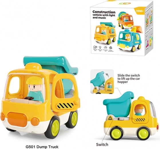 Avtomobilček se zlahka premika po tleh, frikcijski pogon omogoča gladko vožnjo brez potrebe po baterijskem motorju. Otroke bodo razveselila odpirajoča se bočna vrata kabine in premičen prekucni keson, ki razvijata fino motoriko in domišljijo.