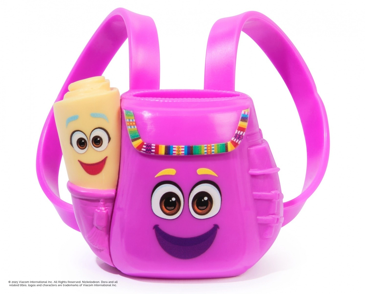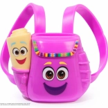 Del kompleta je ikonični vijoličen nahrbtnik z nasmejanim obrazom – ob pritisku se odpre zgornji del, pripravljen na male zaklade z dogodivščin. Punčka je zasnovana za domiselno igro, podpira fino motoriko in naravno učenje besedišča.