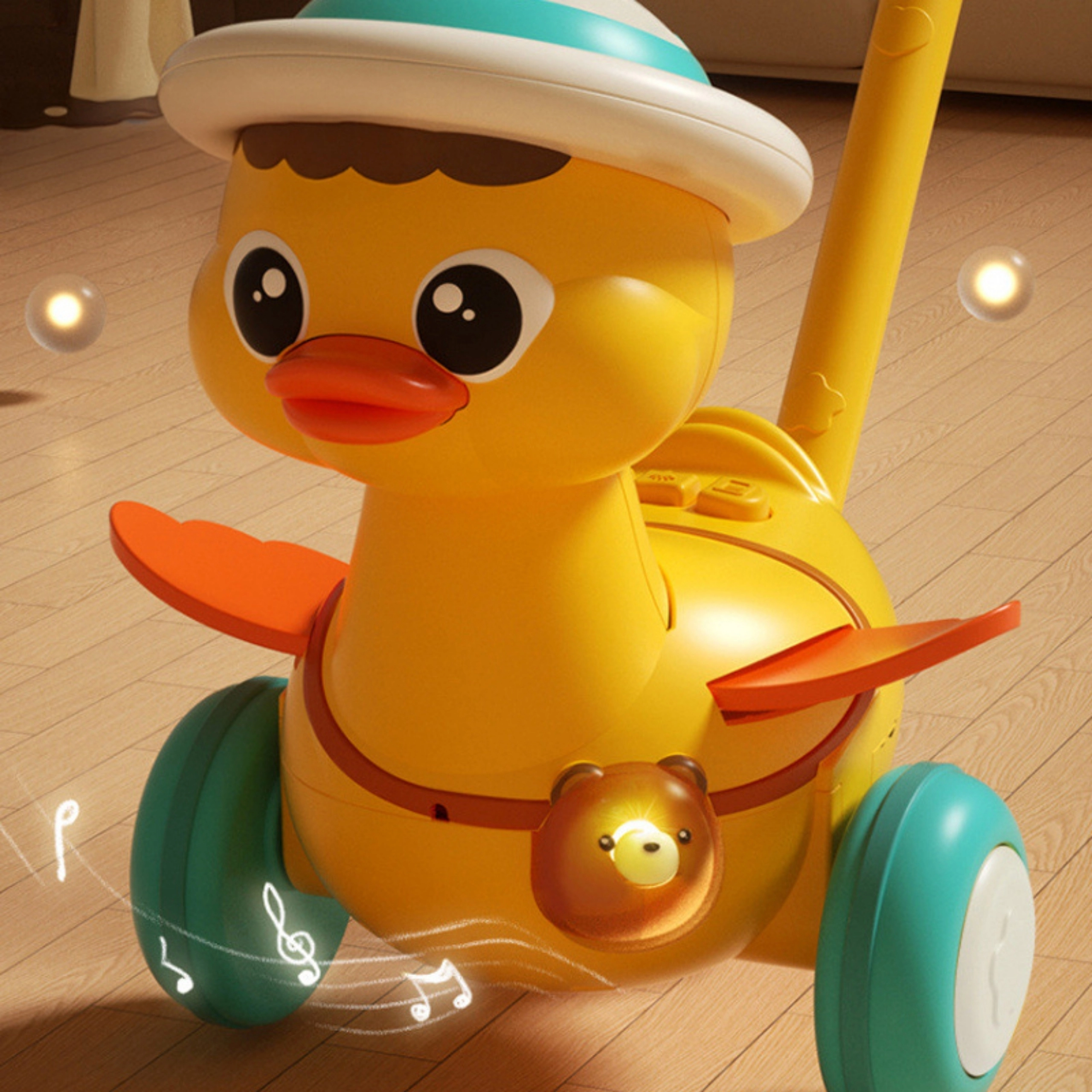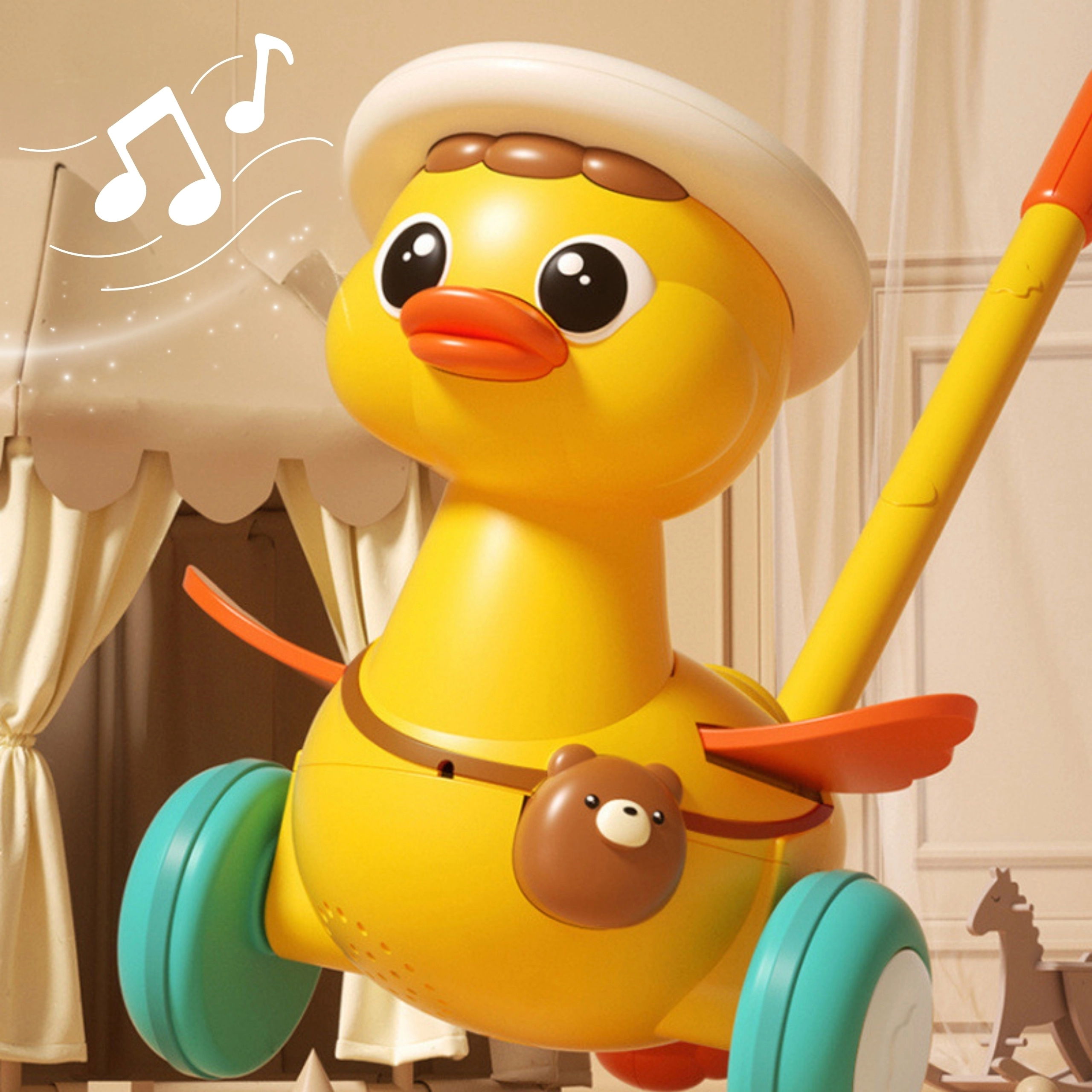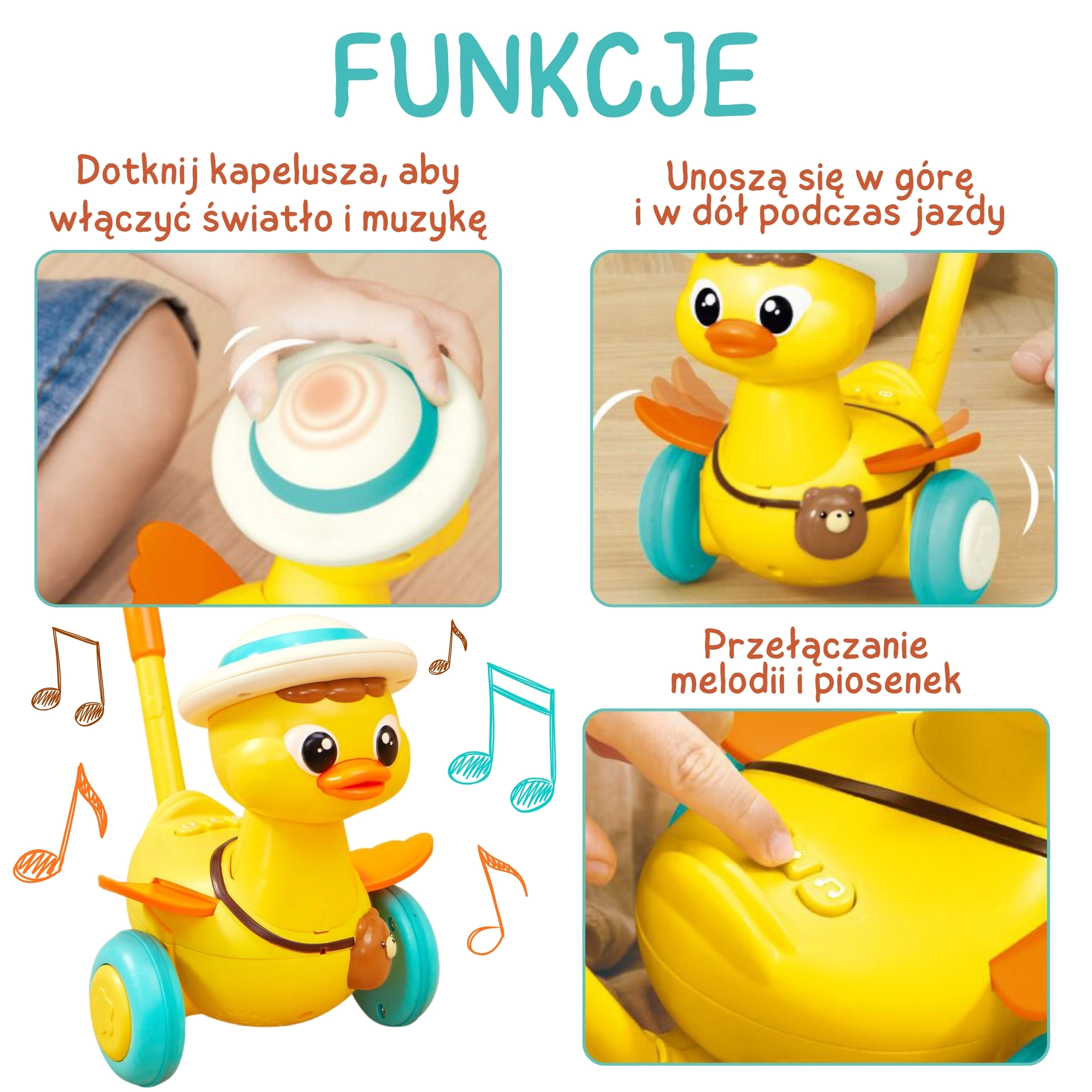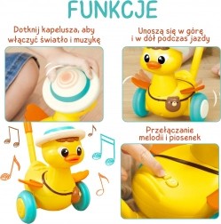 Otroška račkica na vodilni palici WOOPIE je idealna igrača za prve sprehode po stanovanju. Ob gibanju se ljubko pozibava, maha s krilci in z svetlobnimi ter zvočnimi učinki ohranja otrokovo pozornost. Intuitivni gumbi na telesu sprožijo melodije in svetlobne učinke, ki spodbujajo k nadaljnjim korakom.