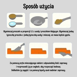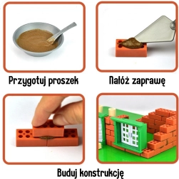Rokovanje je preprosto: zmešajte prašek z vodo 1:1, nanesite malto s špachtlo in polagajte opeke plast za plastjo. Končano hišo lahko za ponovno uporabo potopite v toplo vodo za 1–3 ure – malta se raztopi in dele je mogoče znova uporabiti. Otroško orodje v kompletu uči pravilnih gibov in razvija fino motoriko.