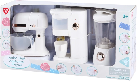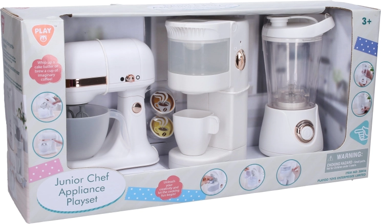 Zabaven komplet otroških kuhinjskih aparatov PLAYGO prinaša realistično igro v kuhinji. Vsebuje mešalnik, kavni aparat z rezervoarjem za vodo in kuhinjskega robota z funkcijami, ki navdušijo otroke in spodbujajo njihovo domišljijo.