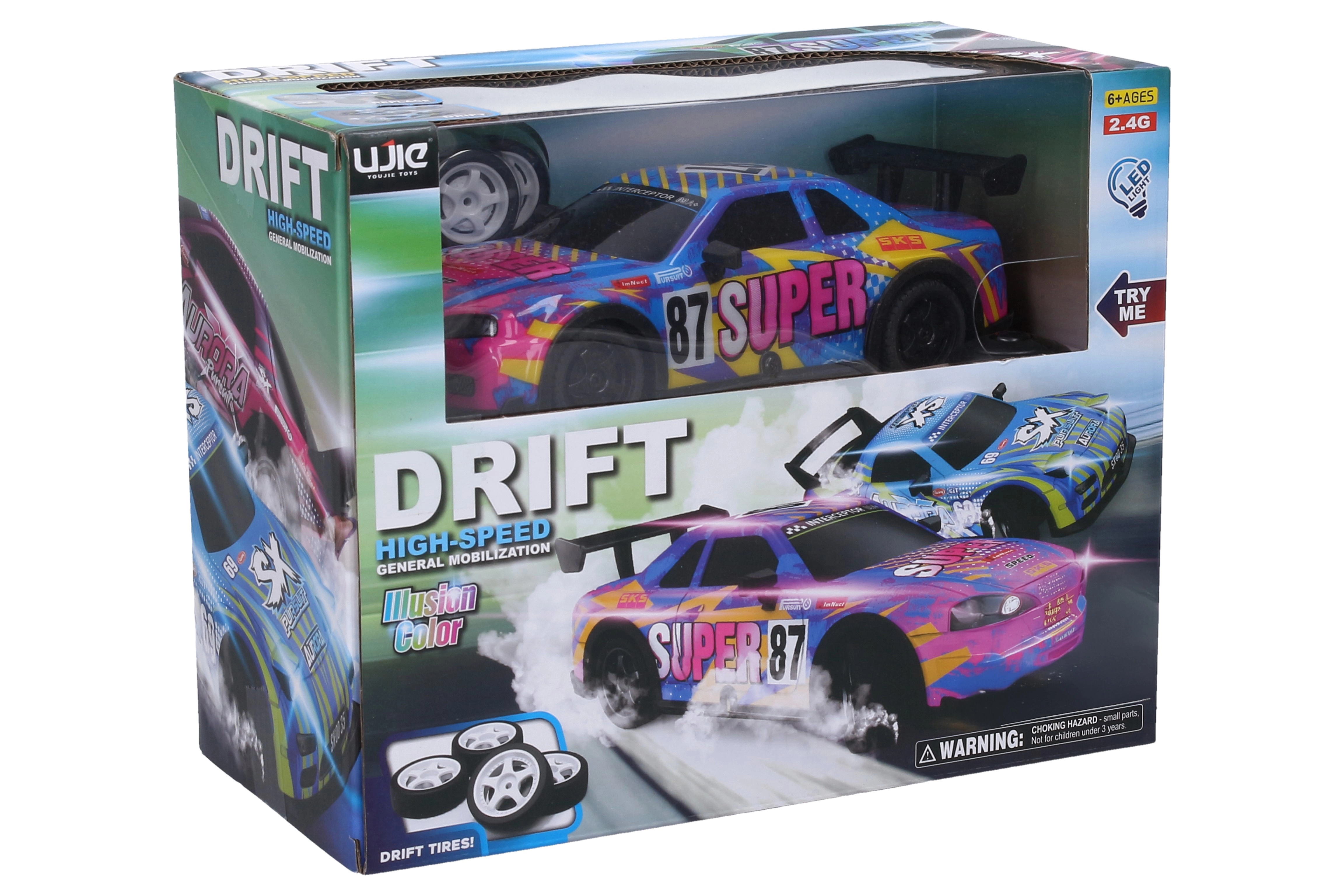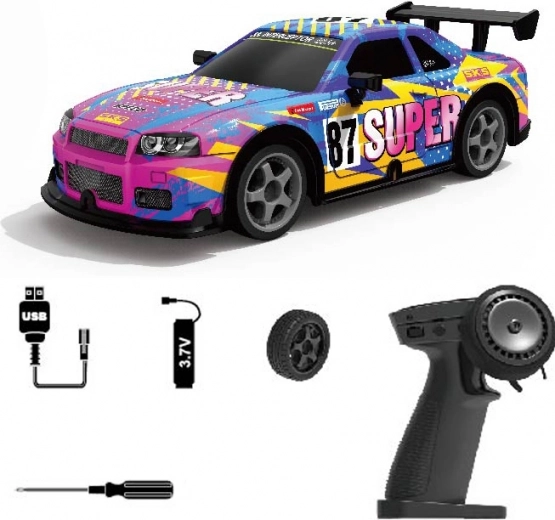 Odkrijte RC avto, ki prinaša maksimalno zabavo na katerikoli podlagi. Zahvaljujoč zamenljivim kolesom lahko enostavno preklapljate med standardno vožnjo in driftanjem. Za atraktiven videz poskrbijo svetlobni učinki karoserije, ki jih lahko aktivirate neposredno na upravljalniku. Zaradi kompaktnih dimenzij 20×8×6 cm je avto idealen za notranje prostore in manjše zunanje površine.