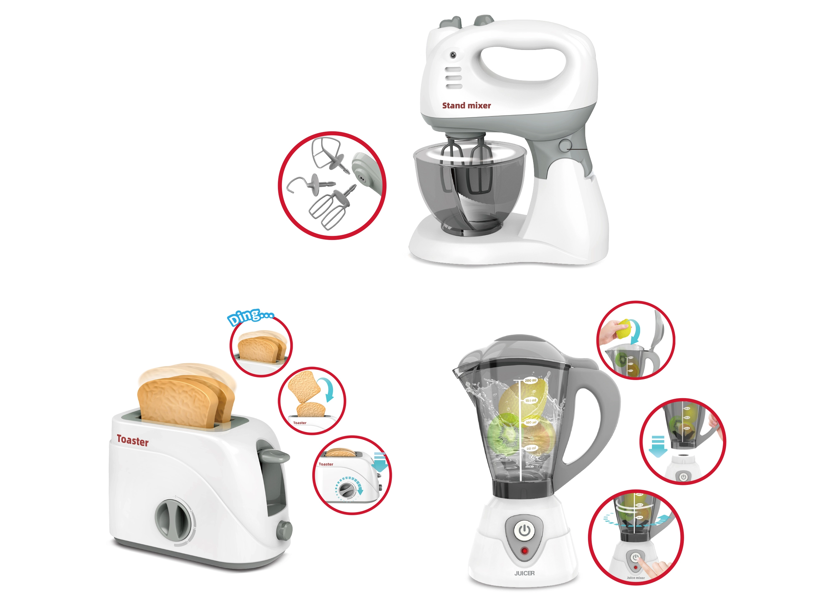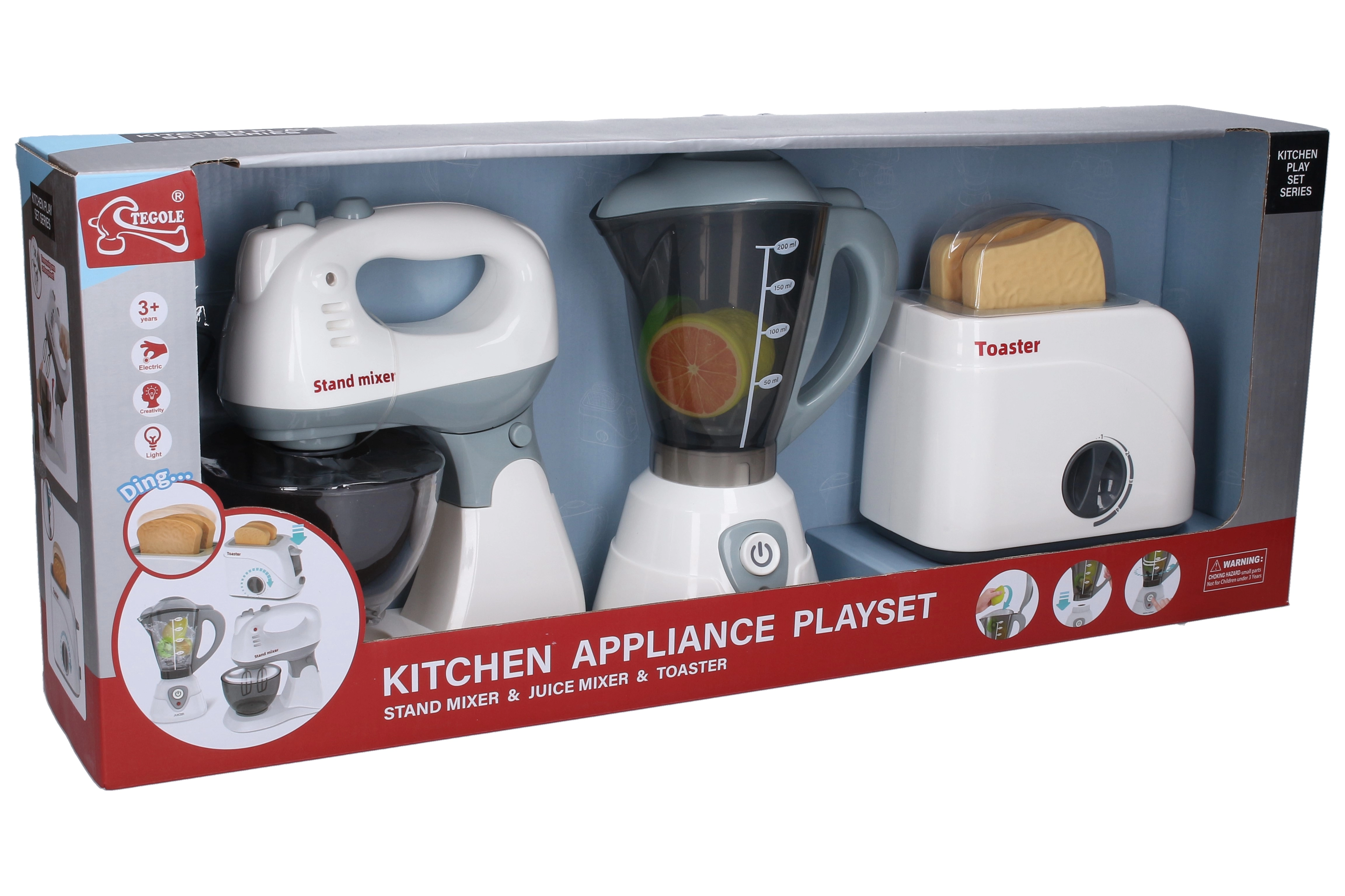 Odkrijte zabaven otroški komplet kuhinjskih aparatov z realističnimi funkcijami, ki otrokom približa svet kuhanja. Komplet vsebuje mešalnik z odstranljivim vrčem, toster s časovnikom in ročni mešalnik z izmenljivimi metlicami. Svetlobni učinki in funkcionalni elementi, kot so stikala on/off, izskočni toasti ter odstranljivi deli, zagotavljajo ure varne in ustvarjalne igre.