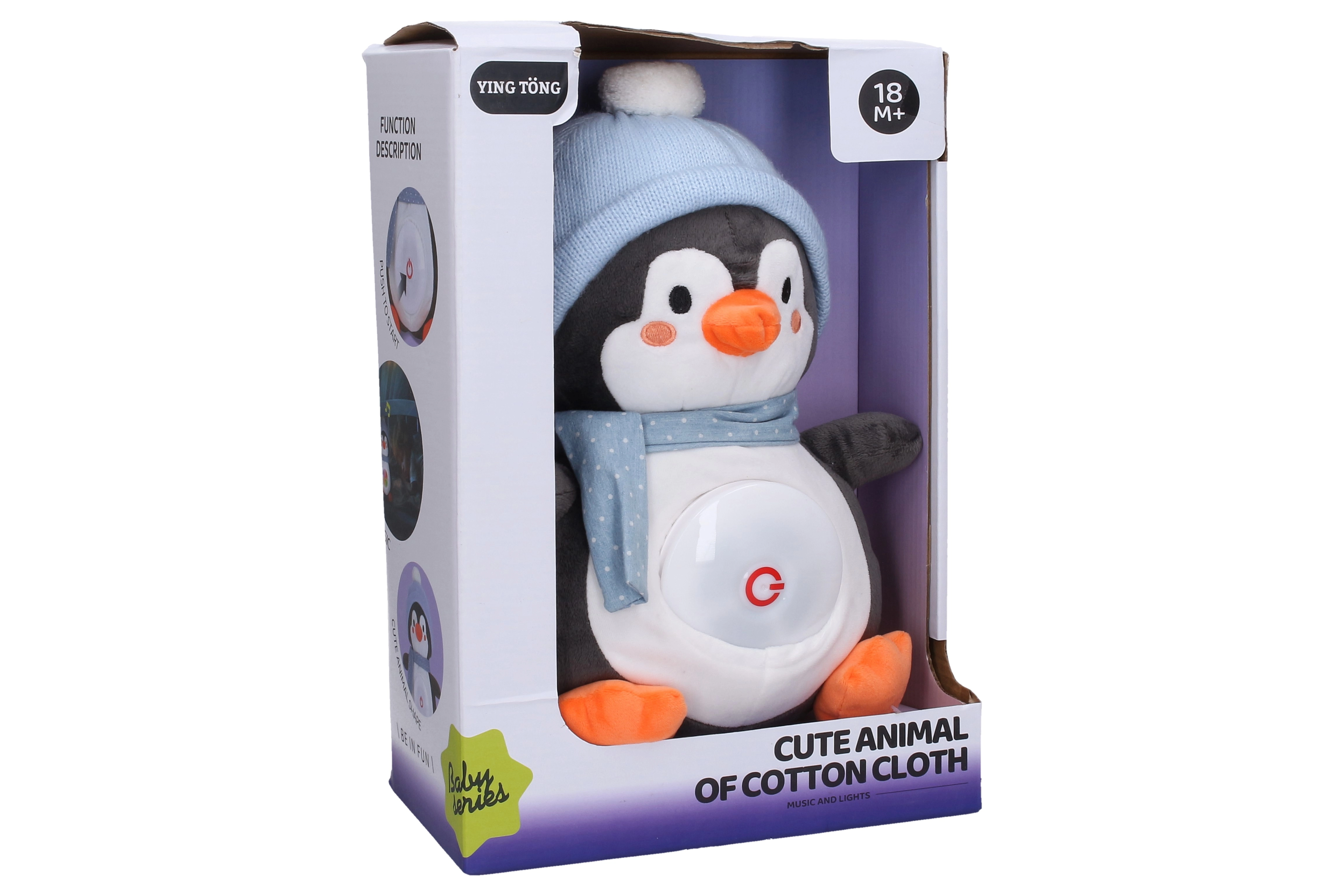 Ta mehak uspavalček pingvin ustvarja prijetno vzdušje za spanje. Trebušček igrače med predvajanjem gladko menja barve, kar otrokom vzbuja občutek varnosti in miru. Zahvaljujoč preglednemu upravljanju na trebuščku zlahka zaženete in preklopite eno od 5 melodij.