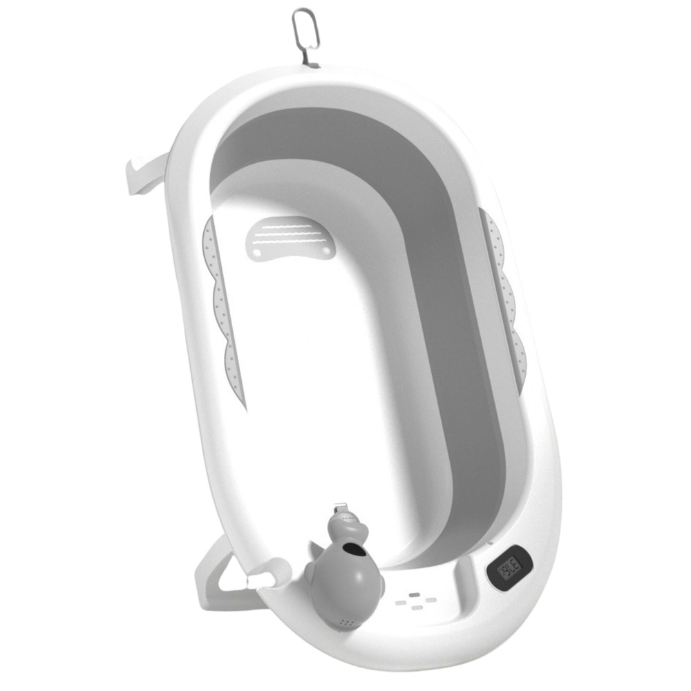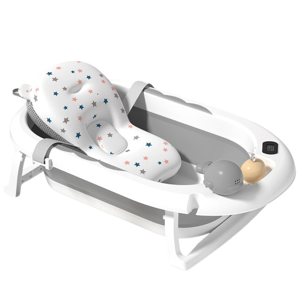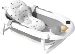 Ta zložljiva otroška banjica je idealna izbira za vsakodnevno higieno dojenčka doma in na poti. Vgrajen LED elektronski termometer omogoča hiter in natančen odčitek temperature vode, zato bo kopel vedno prijetna in varna. Mehak vloženi ležalnik stabilizira dojenčka in pomaga staršem pri zanesljivem držanju brez nepotrebnega naprezanja.