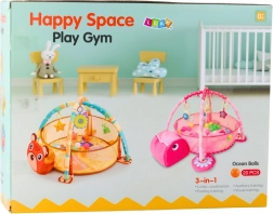 Ko dvignete robove, se podloga spremeni v ograjico/bazenek z 20 barvnimi žogicami, ki spodbujajo razvoj čutov in učenje barv. Žive barve in prijetni motivi spodbujajo vid in vzbujajo radovednost med vsakodnevno igro.