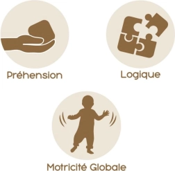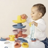 Otroci bodo vzljubili pisane elemente: kroglični labirint, vrteče zobnike, stolp za kroglice in vstavljanko oblik. Vsaka aktivnost je zasnovana tako, da podpira motorični razvoj, potrpežljivost in razumevanje vzroka in posledice.