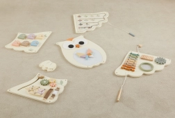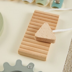 Ksilofon, zobniki, labirint, drsni in odpirajoči se elementi, kroglice ter vratca s presenečenjem – vse to motivira otroke k raziskovanju in razvija fino motoriko ter logiko.