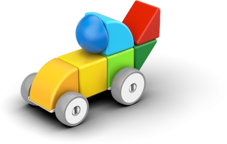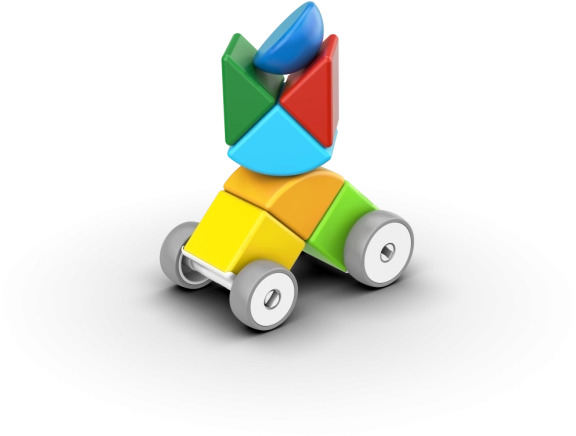 - 7 magnetnih elementov različnih oblik in barv, 4 kolesa, 2 podvozja