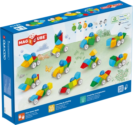 Odkrijte zabavno magnetno sestavljanko Geomag Magicube s 13 kosi, ki spodbuja ustvarjalnost, fino motoriko in logično razmišljanje otrok že od 1. leta. Komplet iz reciklirane plastike vsebuje magnetne oblike ter kolesa s podvozji za gradnjo barvitih avtomobilčkov in drugih stvaritev.
