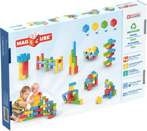 Odkrijte 3D ustvarjanje z magnetnimi kockami GEOMAG MAGICUBE. Zahvaljujoč posebni notranji zasnovi se kocke privlačijo z vseh šestih strani, trdno držijo tudi v prostem prostoru in omogočajo preprosto in varno gradnjo že od 1. leta dalje. Paket vsebuje 64 kock v štirih barvah iz 100% reciklirane plastike, izdelano v Švici.