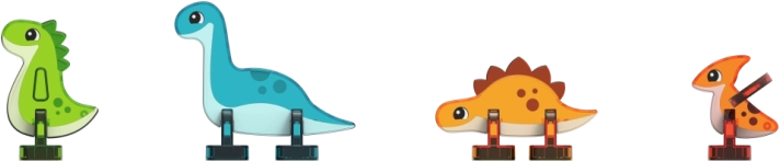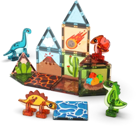 Del paketa so tudi 4 figurice dinozavrov, ki gradnji dodajo zgodbo in vsako stvaritev spremenijo v pravo pustolovščino. Sestavljanka je idealna za prvo spoznavanje načel magnetizma ter razvoj fine motorike in logičnega mišljenja.