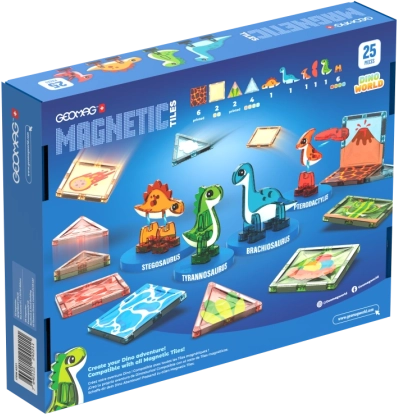 Odkrijte zabavno magnetno sestavljanko Geomag Magnetic Tiles Dino s skupno 25 deli in 4 prisrčnimi dinozavri. Zahvaljujoč magnetom na vseh straneh delov lahko otroci zlahka ustvarjajo 2D like in 3D strukture. Sestavljanka razvija ročne spretnosti, kreativnost in domišljijo, uči barve in geometrijske oblike. Primerno za otroke od 3 let.