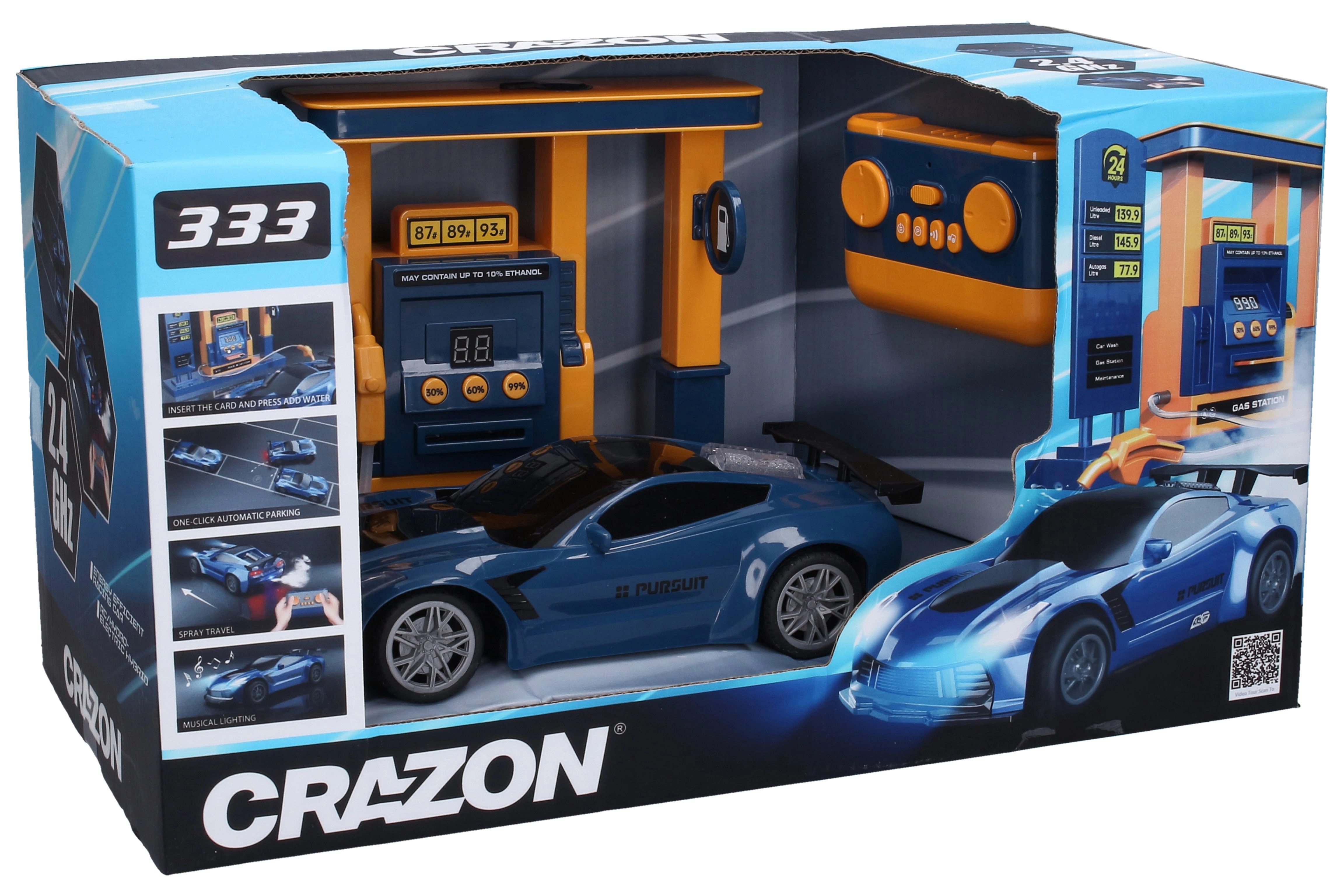 Na upravljalniku imate na voljo stikalo ON/OFF, gumbe za svetlobne in dimne učinke, samodejno parkiranje in zvočne učinke. Črpalna postaja deluje kot rezervoar za vodo, z “pištolo” (cevjo) pa dolijete vodo v avto. Za črpanje preprosto vstavite kartico v postajo in dolgo držite enega od gumbov 30 % / 60 % / 90 % za polnjenje.