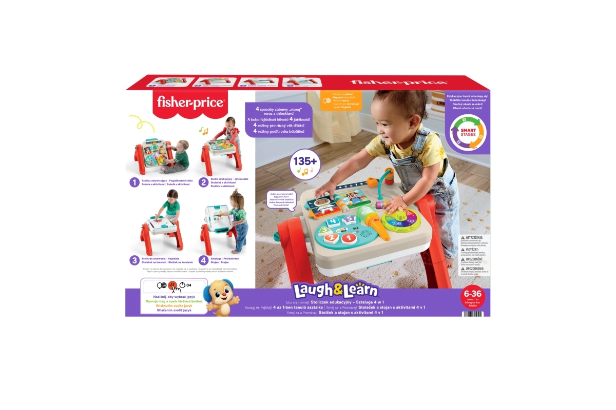 Interaktivna mizica FISHER-PRICE 4 v 1 prinaša pametno učenje skozi igro v vsaki fazi razvoja. Otroke zabava paleta »umetnika« z učenjem števil, barv in oblik, vrteče se barvno kolesce z glasbo, vrtljiva knjižica, kroglična letvica in vrteči spinner za razvoj fine motorike. Načine Smart Stages preprosto prilagodite starosti in napredku otroka.