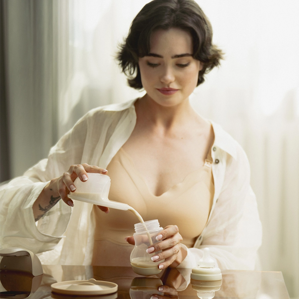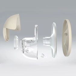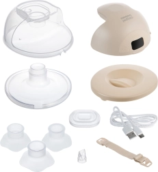 - Posodica za mleko; ohišje črpalke z upravljalno ploščo; silikonski lijak 24 mm; silikonski vložki 17/19/21 mm; pokrov/stojalo; povratni ventil; silikonska membrana; kabel USB‑C; tekstilni nastavek za nedrček (1 kos)