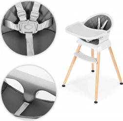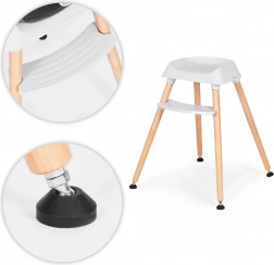 5-točkovni pasovi, mednožni element in stabilne lesene noge z nedrsečimi nastavki ščitijo otroka pred zdrsom in zagotavljajo maksimalno stabilnost.