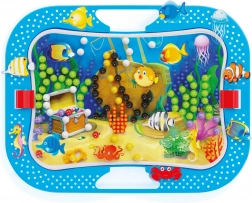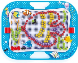 Ta ustvarjalna mozaik igra je idealna za predšolske otroke in mlajše šolarje. Perforirana plošča je vstavljena v trden okvir z zaobljenimi robovi, zato je za otroke varna in prijetna za uporabo. Z barvnimi žebljički otroci ustvarjajo zabavne motive iz oceana – od pisanih ribic do drugih morskih bitij. S pomočjo predlog in proste ustvarjalnosti razvijajo domišljijo in potrpežljivost.