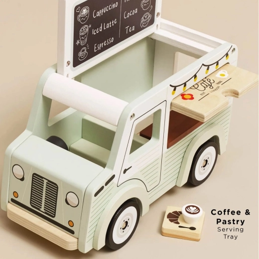 Stilska mobilna kavarna Le Toy Van bo razveselila male bariste s svojim retro videzom in kakovostno izdelavo iz lesa s certifikatom FSC. Ponuja odpirajočo strešico, strežno okence in pladenj za serviranje z dodatki za realistično igro. Je ročno dodelana z netoksičnimi barvami na vodni osnovi ter spodbuja kreativnost in igranje vlog.