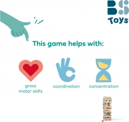 Zabavna spretnostna igra v slogu Jenge za 2–10 igralcev od 4 let naprej, ki združuje napetost z učenjem števil. Igralci mečejo kocko in odstranjujejo bloke glede na rezultat – en blok ali dva, katerih vsota ustreza metu. Cilj je ohraniti stolp v ravnotežju in hkrati razvijati številčne spretnosti, motoriko, koordinacijo oko–roka, koncentracijo in potrpežljivost.