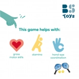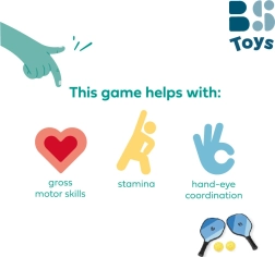 V paketu najdete popolno opremo za 2 igralca: 2 lesena loparja (40 × 19 cm), 2 žogici, prenosno mrežo in torbo za enostavno shranjevanje in prenašanje. Pravil se naučite v trenutku, igrati pa lahko tudi na manjšem igrišču – na primer na šolskem dvorišču ali v telovadnici.