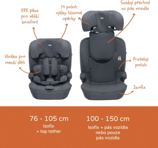 Iščete en avtosedež, ki bo varno spremljal vašega otroka od malčka do šolarja? Zopa Alfa i-Size z Isofixom pokriva višino 76–150 cm, izpolnjuje strog standard ECE R129 (i-Size) in združuje enostavno uporabo z visoko stopnjo zaščite. Za mlajše otroke (do 105 cm) uporabite pettočkovni varnostni pas in čvrsto sidranje Isofix + Top Tether. Za večje otroke (100–150 cm) se sedež uporablja s tritočkovnim varnostnim pasom vozila.