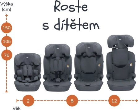 - Varna namestitev: Isofix in Top Tether za mlajše otroke, kasneje uporaba s tritočkovnim pasom vozila.