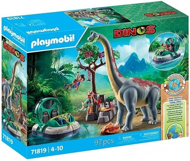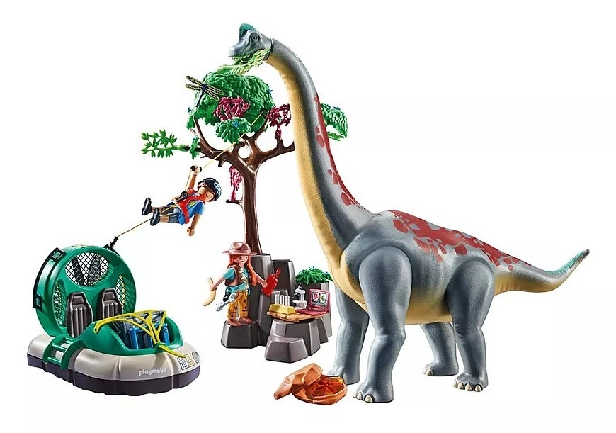 Odkrijte svet dinozavrov s podrobnim setom, ki združuje akcijske raziskave, spoznavanje narave in vodno zabavo. Zračni čoln sprejme dve figuri in je idealen za ekspedicije po močvirjih, medtem ko žičnica omogoča hiter premik v krošnje dreves, od koder lahko varno opazujete pašnega brahiozavra.