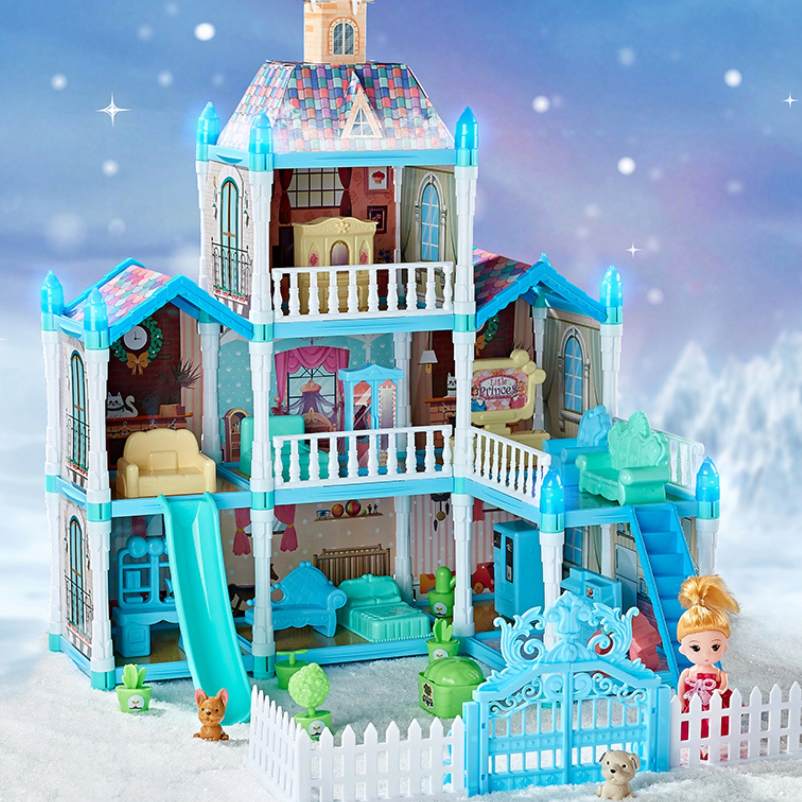 Ta prostoren, trietažni dvorec za punčke otrokom prinaša ure kreativne zabave. Zahvaljujoč 191 elementom lahko oblikujejo interier, skrbijo za punčko in njene živalske prijatelje ter uživajo v osvetljenih dekoracijah, ki polepšajo igro tudi po mraku. Modro‑rožnata estetika pričara vzdušje zimskega gradu in vrta.