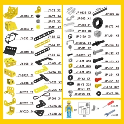 - 218 gradbenih elementov, 2 figurici delavcev, orodje za figurice, izvijač, nastavljivi ključ, knjižica z navodili za montažo