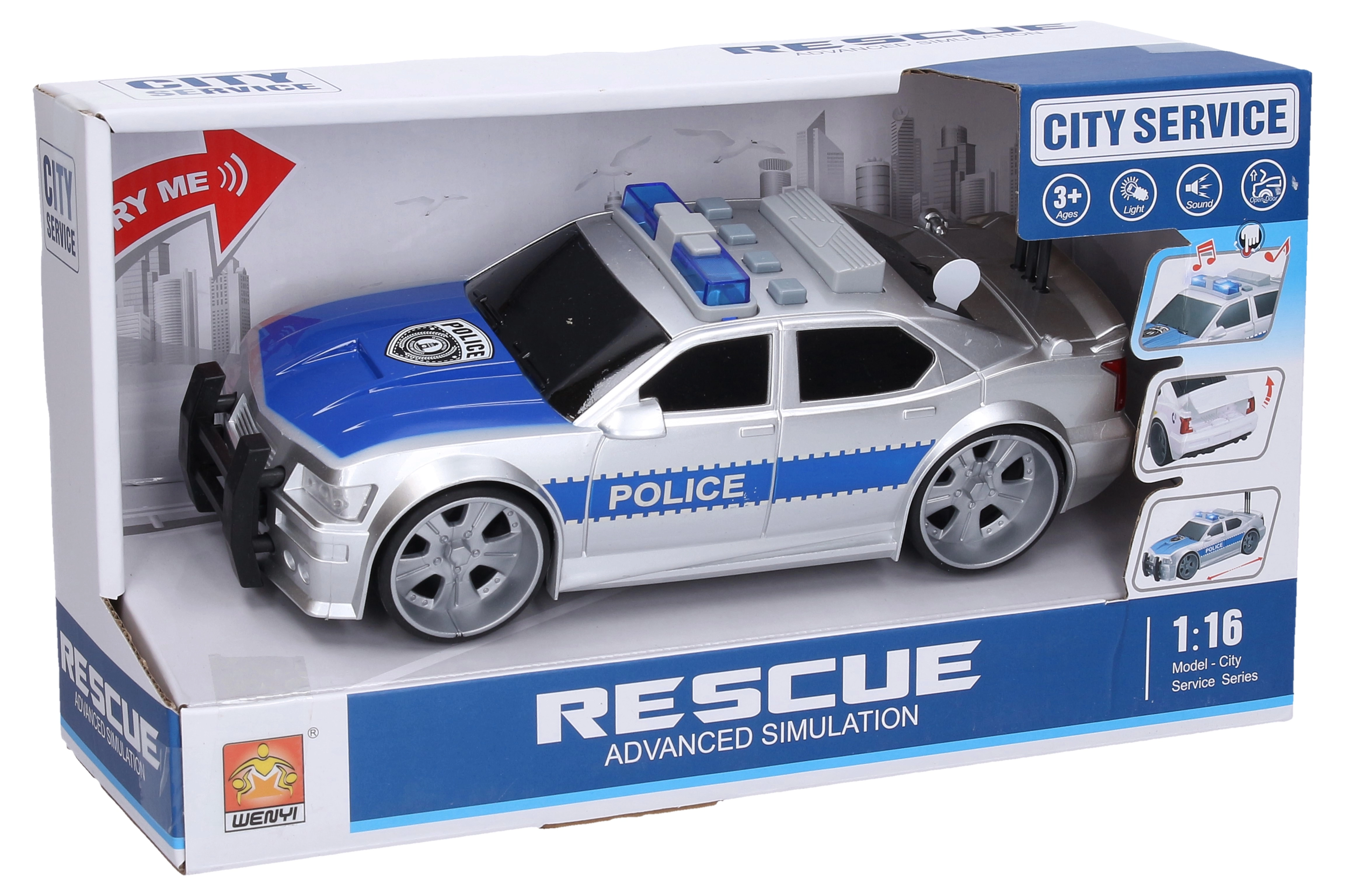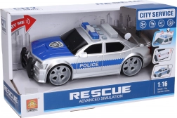 Podajte se v akcijo z podrobno izdelanim policijskim avtom v dolžini 27 cm. Zahvaljujoč pogonu na vztrajnik se vozilo zlahka požene, realistični svetlobni in zvočni učinki (motor, vzvratna vožnja, hupa, sirena) pa obogatijo vsako posredovanje. Pokrov motorja se odpre s preprostim pritiskom gumba na strehi.