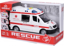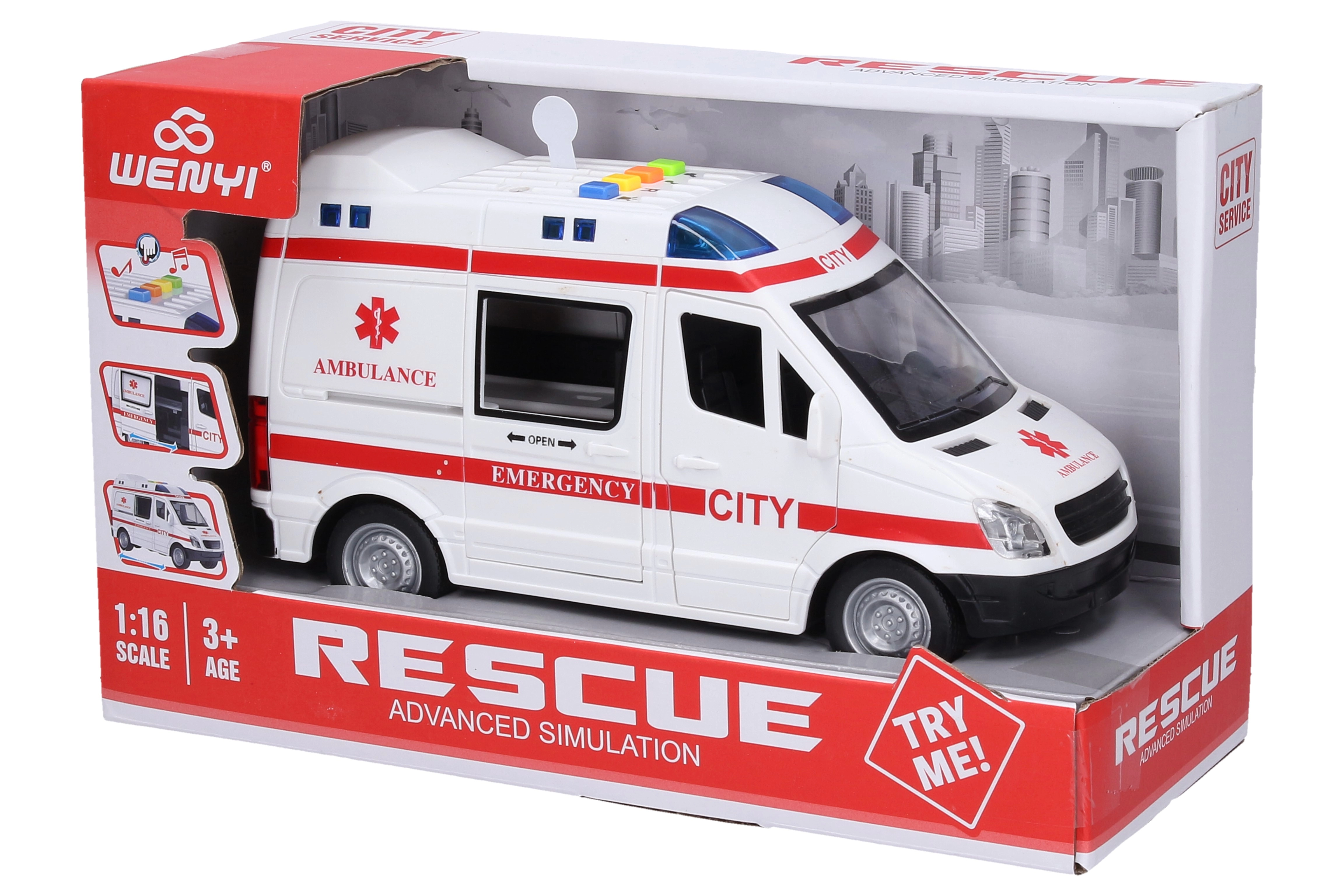 To podrobno izdelano reševalno vozilo bo razveselilo vse male voznike in ljubitelje reševalcev. Zahvaljujoč vztrajniku se zlahka poda na akcijo, luči in zvoki se aktivirajo z gumbi na strehi, odpirajoča se vrata pa podpirajo realistične scenarije igre.