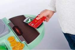 Skener, plačilni terminal in pregledne police z označenimi cenami otrokom omogočajo doživeti pravo vzdušje supermarketa.