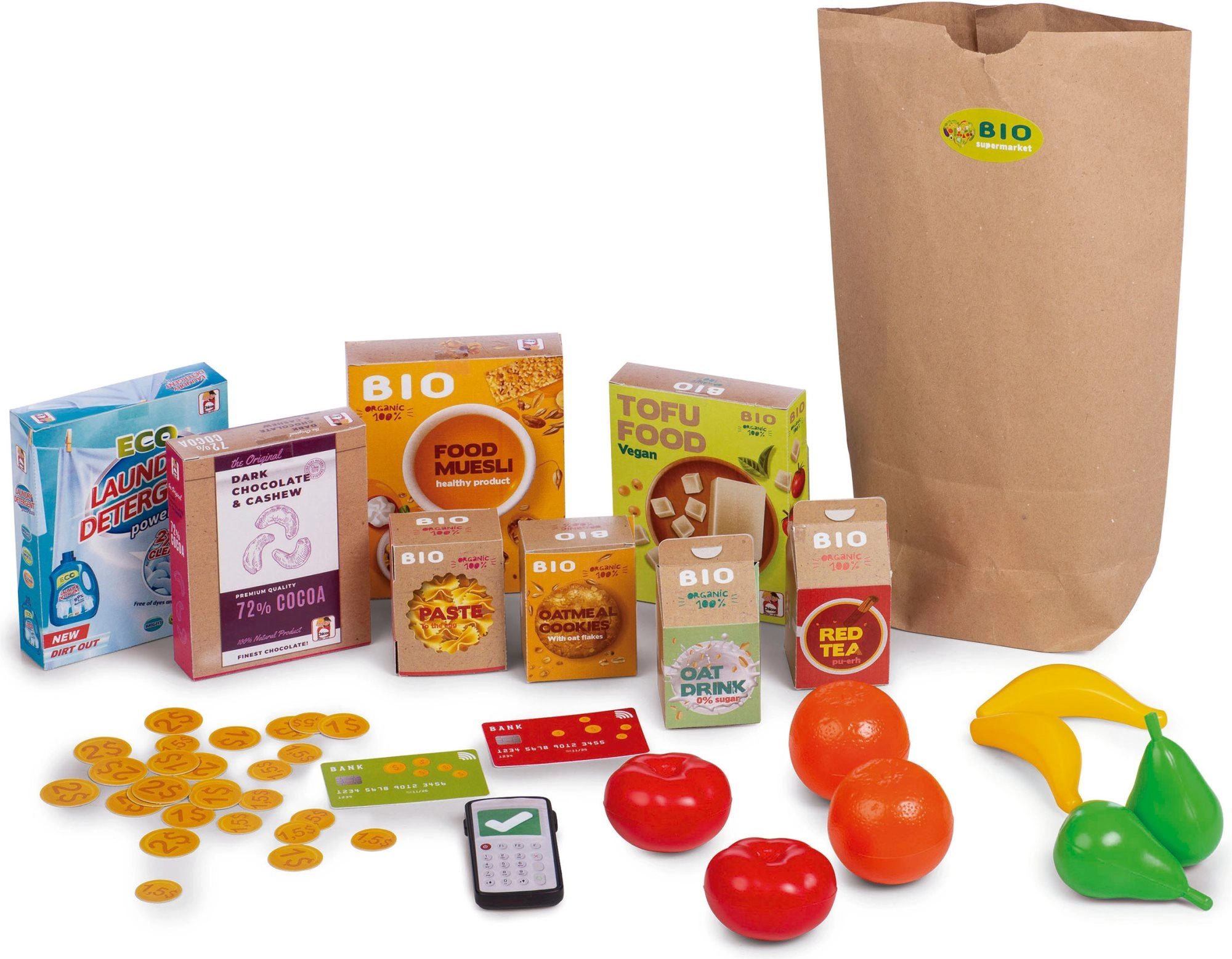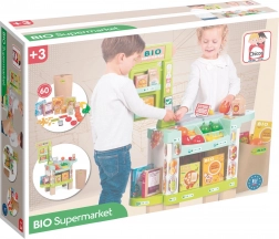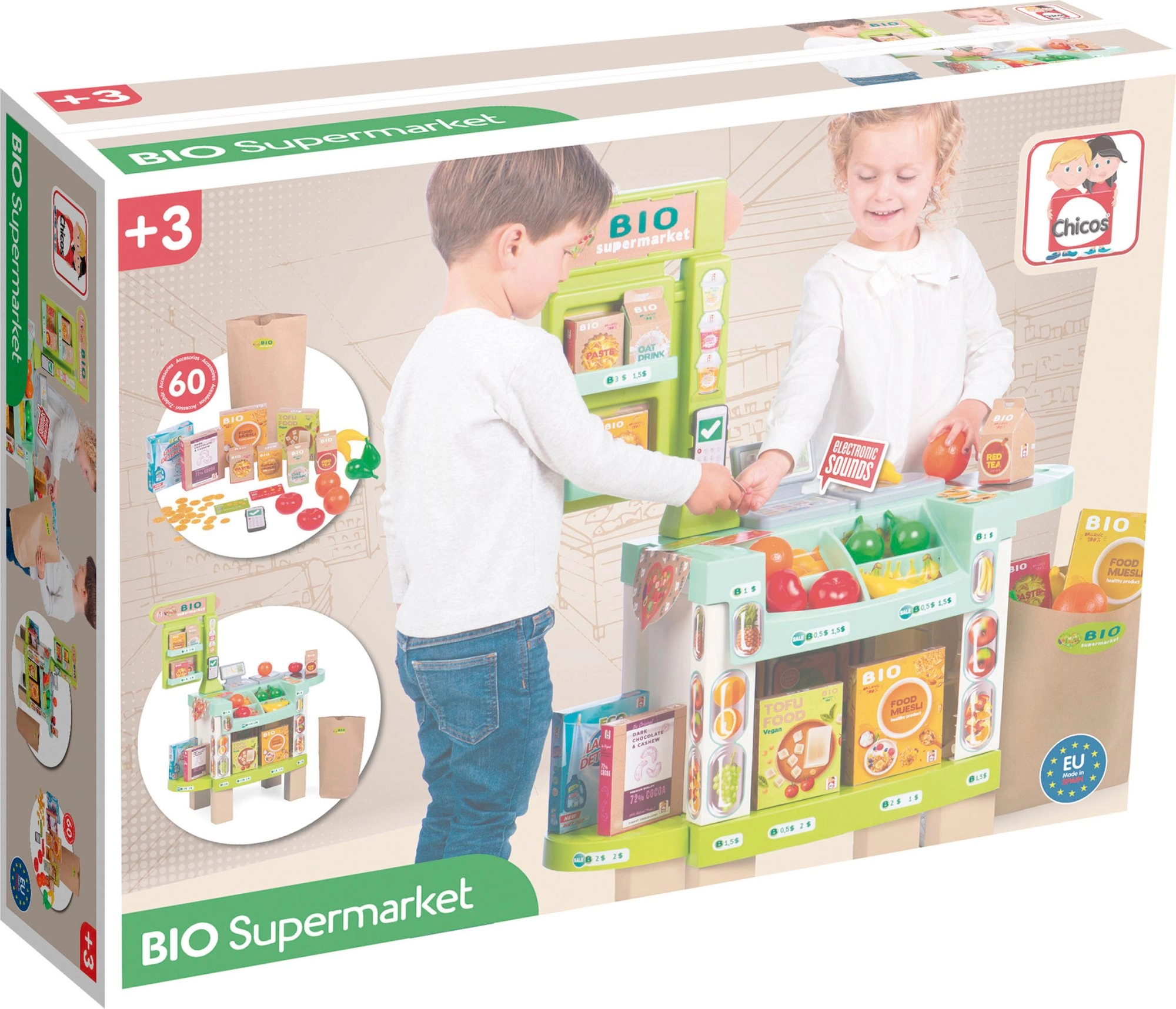 Otroški supermarket BIO CHICOS spremeni sobo v malo prodajalno, kjer si otroci preizkusijo vlogi prodajalca in kupca. Bogat komplet 60 dodatkov, vključno s sadjem, škatlicami z živili, skenerjem in plačilnim terminalom, podpira igranje vlog ter razvoj komunikacije, fine motorike in logičnega mišljenja.