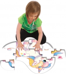 Ta obrisna sestavljanka v obliki samoroga bo navdušila vse male ljubitelje pravljic. Sestavljena slika meri približno 53 × 55 cm, zato je dobro vidna, pregledna in odlična za sestavljanje na tleh. Večji kosi se udobno držijo tudi manjšim otrokom.