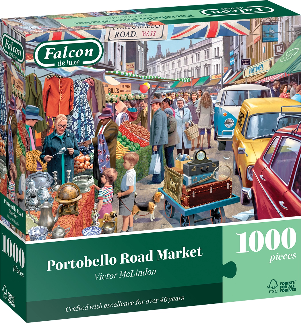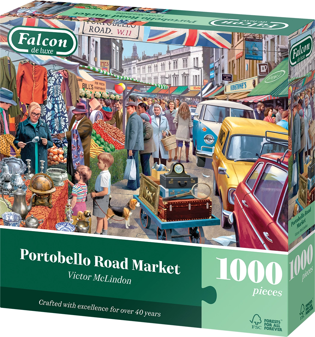 Odkrijte edinstven humor in podrobne ilustracije Jana van Haasterena na motivu živahne tržnice v Portobellu. Vsak pogled razkrije nove šale, like in tipične »podpise« avtorja – od morske plavuti do norih prizorov v množici. Sestavljanka iz kolekcije FALCON / JUMBO izstopa po dovršeni izdelavi in prijetnem materialu za udobno sestavljanje.