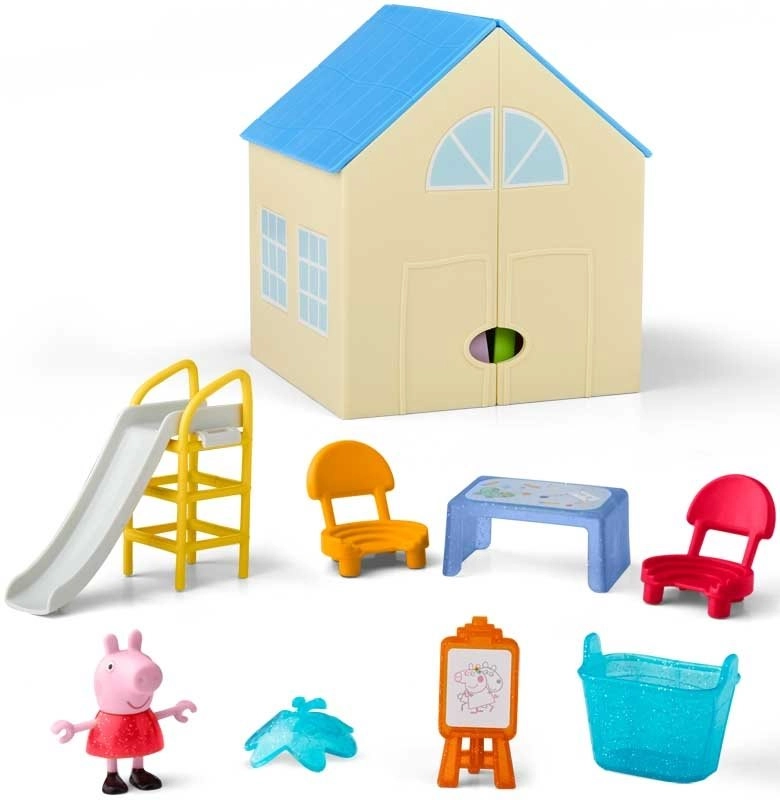 V kompletu je premična figurica Pepe, visoka 7,5 cm, ki lahko sedi na stolčkih, nosi masko in se spušča po toboganu. Zahvaljujoč praktičnemu zapiranju je mogoče po igri vse dele pospraviti v notranjost, tako da se nič ne izgubi.