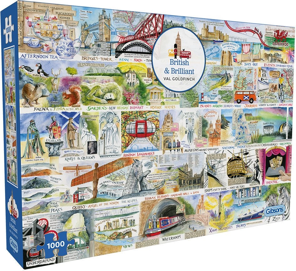 Odkrijte veselje sestavljanja s sestavljanko GIBSONS Britansko in briljantno. Zahvaljujoč kakovostni izdelavi, trpežnim kosom in natančnim izrezom je sestavljanje tekoče in zadovoljivo. Končana sestavljanka velikosti približno 68 × 49 cm izstopa kot dekoracija in kot odlič izziv za vso družino.