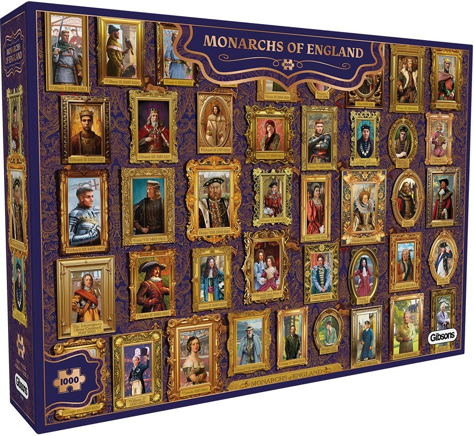Elegantna sestavljanka »Angleški monarhi« znamke GIBSONS prinaša privlačen pogled na pomembne britanske vladarje. Zahvaljujoč 1000 dobro prilegajočim se kosom boste uživali v relaksacijskem sestavljanju in hkrati razširili svoje poznavanje zgodovine. Končni format približno 68 × 49 cm je odličen za uokvirjanje.